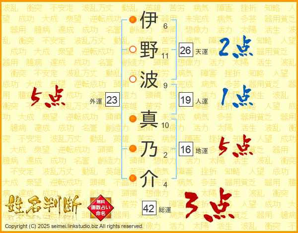 伊(6画)野(11画)波(9画) 真(10画)乃(2画)介(4画)