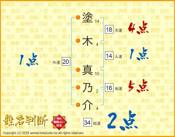 塗(14画)木(4画) 真(10画)乃(2画)介(4画)