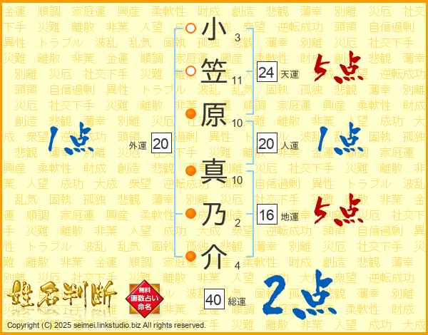 小(3画)笠(11画)原(10画) 真(10画)乃(2画)介(4画)