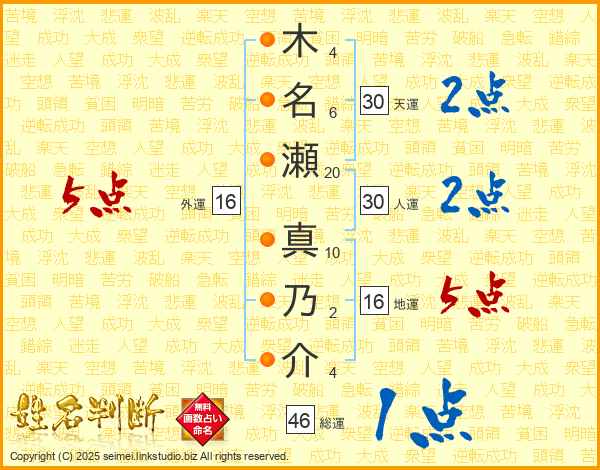 木(4画)名(6画)瀬(20画) 真(10画)乃(2画)介(4画)