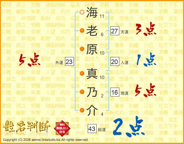 海(11画)老(6画)原(10画) 真(10画)乃(2画)介(4画)