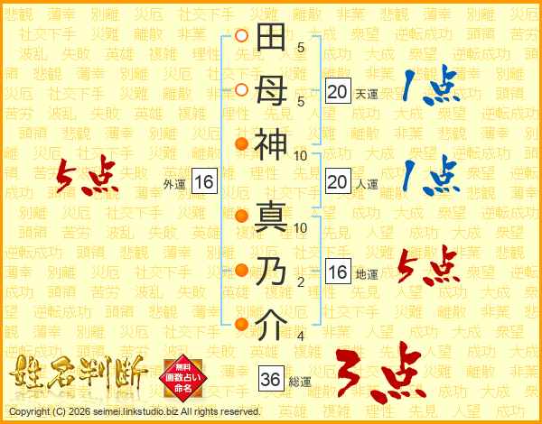 田(5画)母(5画)神(10画) 真(10画)乃(2画)介(4画)