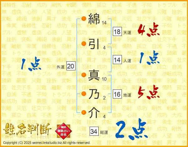綿(14画)引(4画) 真(10画)乃(2画)介(4画)