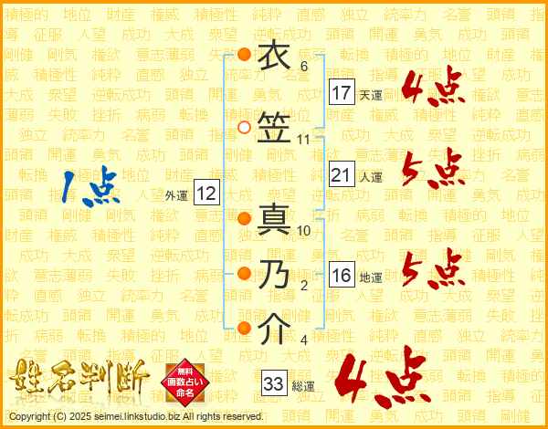 衣笠真乃介さんの総運は33画の4点!