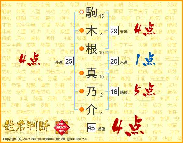 駒(15画)木(4画)根(10画) 真(10画)乃(2画)介(4画)