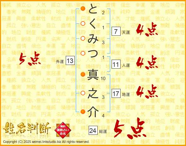 と(2画)く(1画)み(3画)つ(1画) 真(10画)之(3画)介(4画)