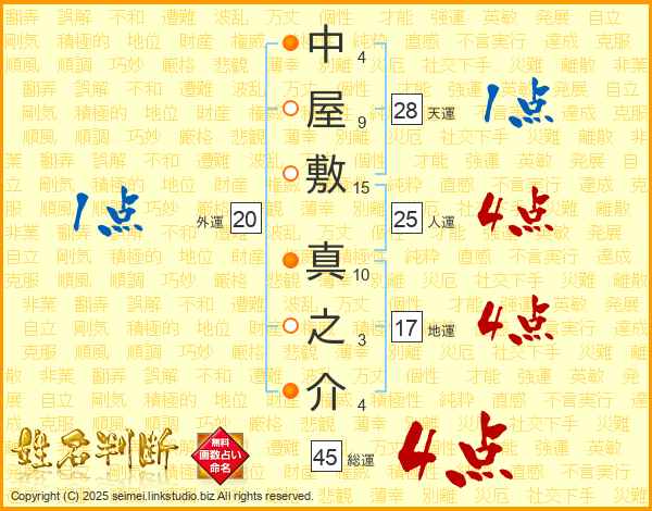 中(4画)屋(9画)敷(15画) 真(10画)之(3画)介(4画)