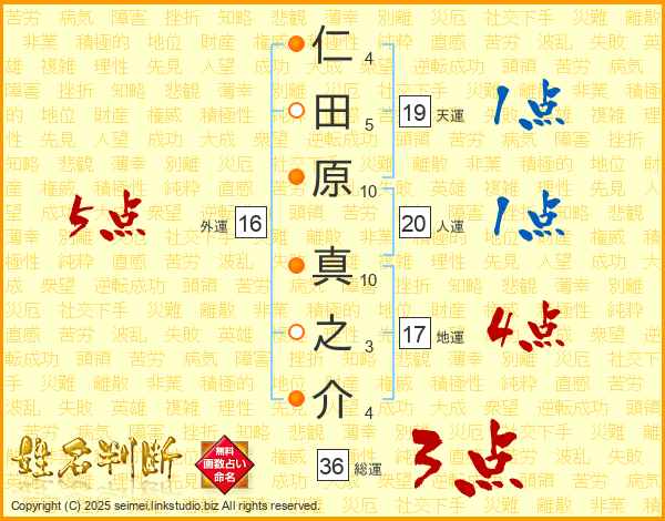 仁(4画)田(5画)原(10画) 真(10画)之(3画)介(4画)