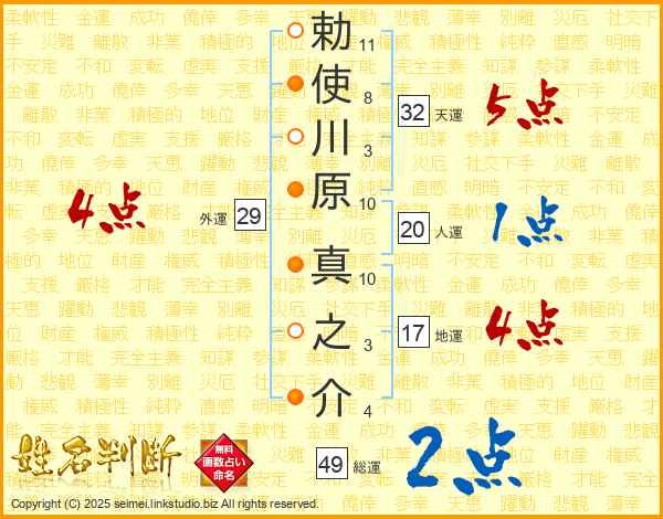 勅(11画)使(8画)川(3画)原(10画) 真(10画)之(3画)介(4画)