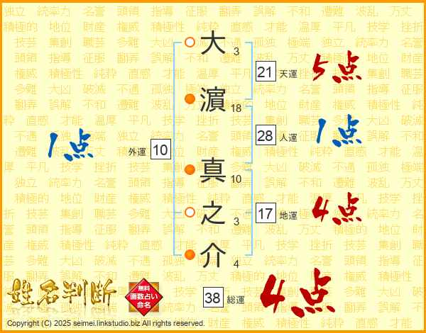 あなたの人生を表す1番重要な運勢です。生涯を通じて影響する総合運となり、主に50歳以降の晩年期に影響を及ぼします。苗字と名前の合計画数。