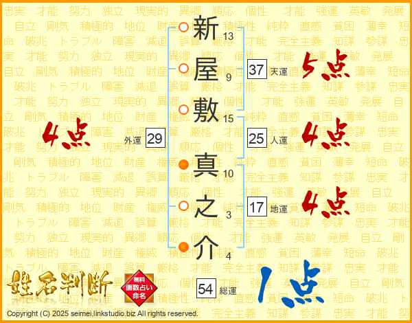 新(13画)屋(9画)敷(15画) 真(10画)之(3画)介(4画)