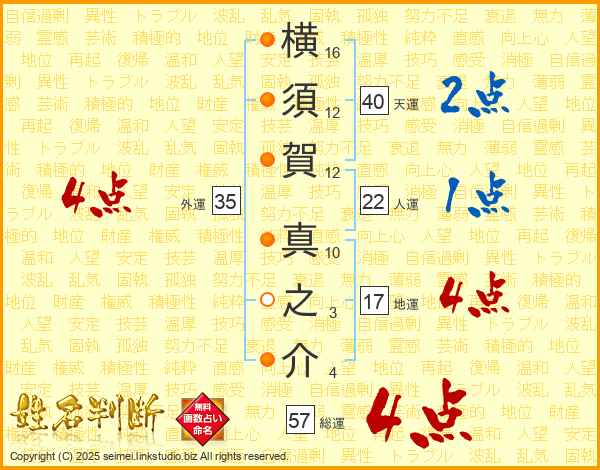 横(16画)須(12画)賀(12画) 真(10画)之(3画)介(4画)