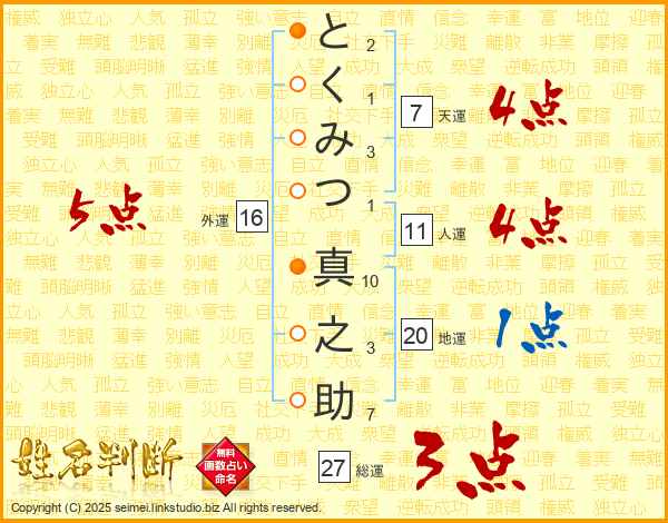 と(2画)く(1画)み(3画)つ(1画) 真(10画)之(3画)助(7画)