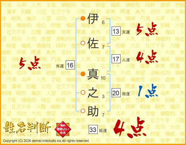 伊(6画)佐(7画) 真(10画)之(3画)助(7画)