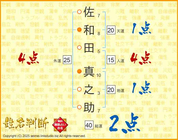 佐(7画)和(8画)田(5画) 真(10画)之(3画)助(7画)