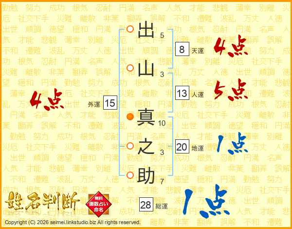 出(5画)山(3画) 真(10画)之(3画)助(7画)