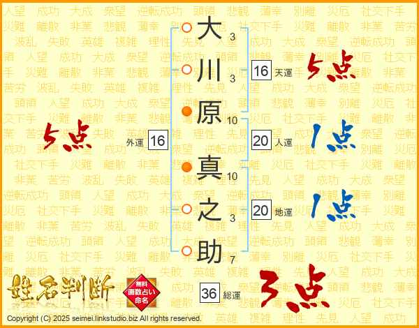 大(3画)川(3画)原(10画) 真(10画)之(3画)助(7画)