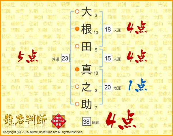 大(3画)根(10画)田(5画) 真(10画)之(3画)助(7画)