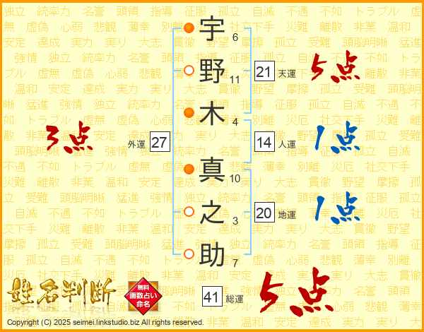 宇(6画)野(11画)木(4画) 真(10画)之(3画)助(7画)
