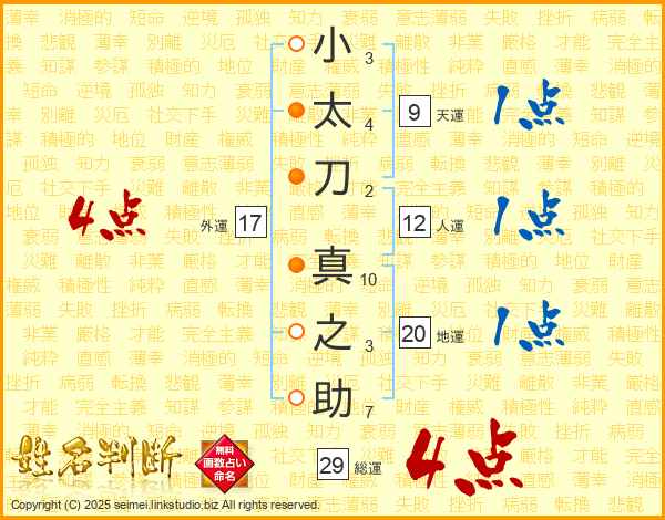 小(3画)太(4画)刀(2画) 真(10画)之(3画)助(7画)