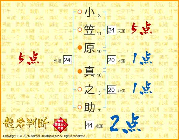 小(3画)笠(11画)原(10画) 真(10画)之(3画)助(7画)