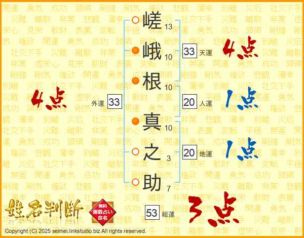 嵯(13画)峨(10画)根(10画) 真(10画)之(3画)助(7画)