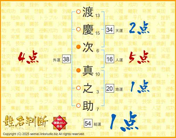 渡(13画)慶(15画)次(6画) 真(10画)之(3画)助(7画)
