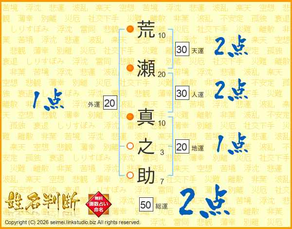 荒(10画)瀬(20画) 真(10画)之(3画)助(7画)