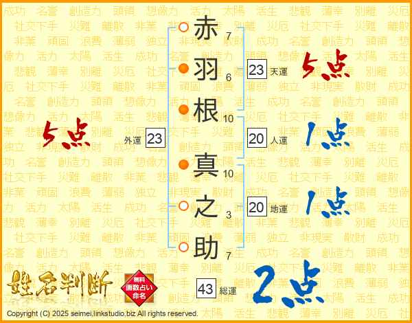 赤(7画)羽(6画)根(10画) 真(10画)之(3画)助(7画)