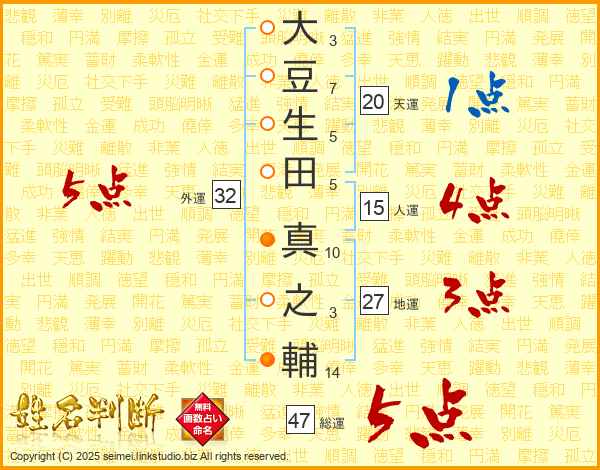 大(3画)豆(7画)生(5画)田(5画) 真(10画)之(3画)輔(14画)