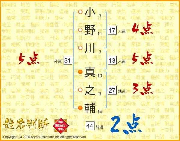 小(3画)野(11画)川(3画) 真(10画)之(3画)輔(14画)