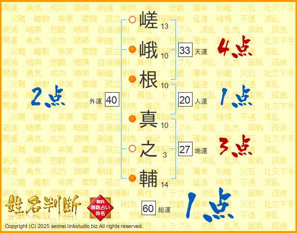 嵯(13画)峨(10画)根(10画) 真(10画)之(3画)輔(14画)