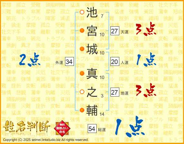 池(7画)宮(10画)城(10画) 真(10画)之(3画)輔(14画)