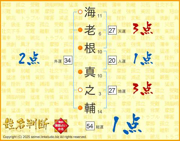 海(11画)老(6画)根(10画) 真(10画)之(3画)輔(14画)