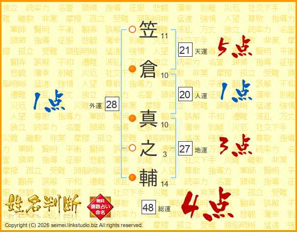 笠倉真之輔さんの総運は48画の4点!
