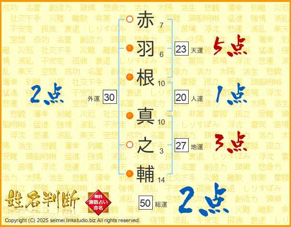 赤(7画)羽(6画)根(10画) 真(10画)之(3画)輔(14画)