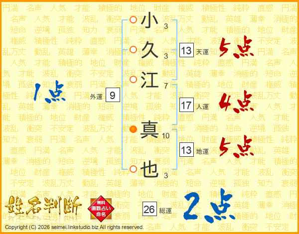 小(3画)久(3画)江(7画) 真(10画)也(3画)