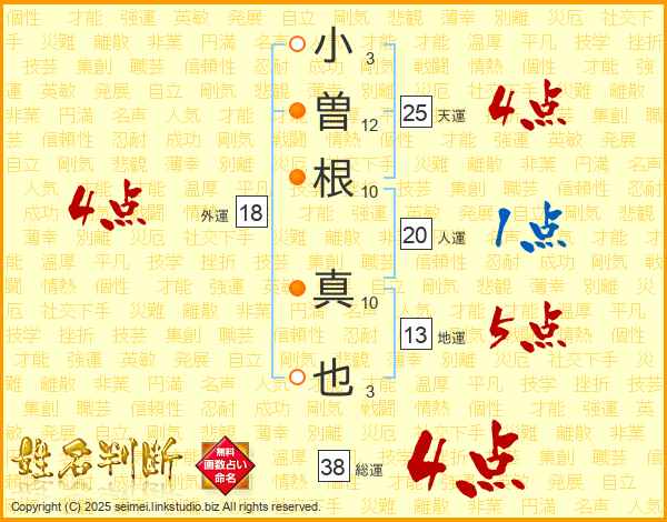 小(3画)曽(12画)根(10画) 真(10画)也(3画)