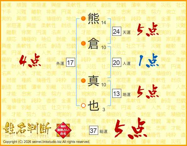 熊倉真也さんの総運は37画の5点!