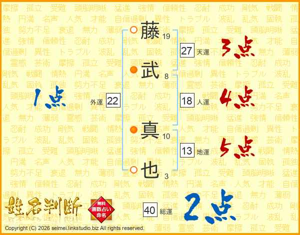 あなたの人生を表す1番重要な運勢です。生涯を通じて影響する総合運となり、主に50歳以降の晩年期に影響を及ぼします。苗字と名前の合計画数。