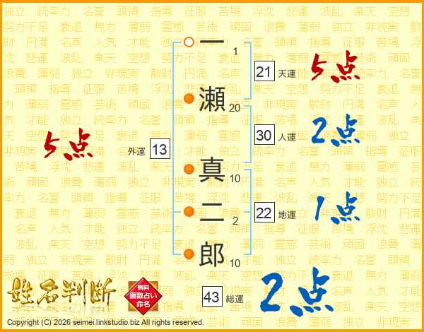一(1画)瀬(20画) 真(10画)二(2画)郎(10画)