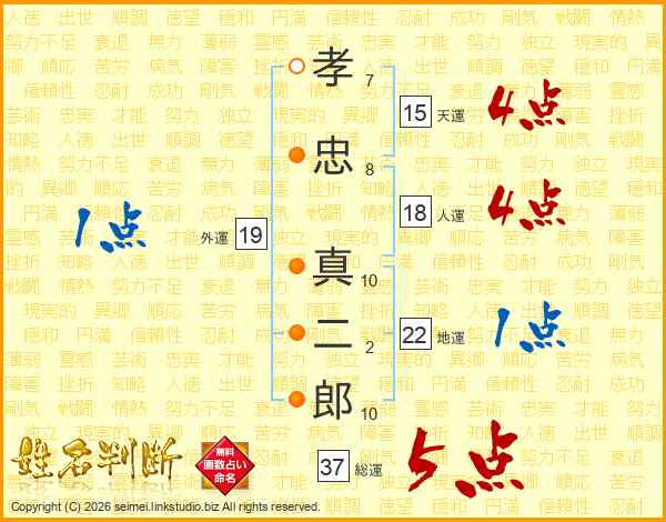 孝忠真二郎さんの総運は37画の5点!