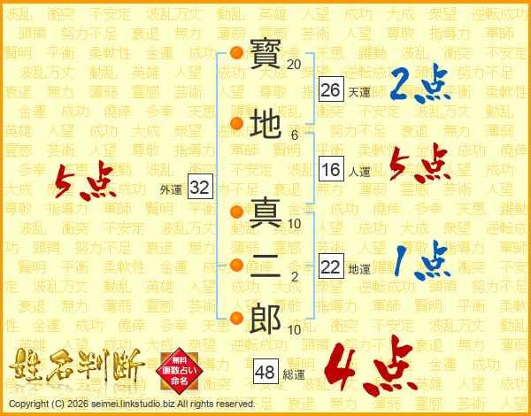 寳(20画)地(6画) 真(10画)二(2画)郎(10画)