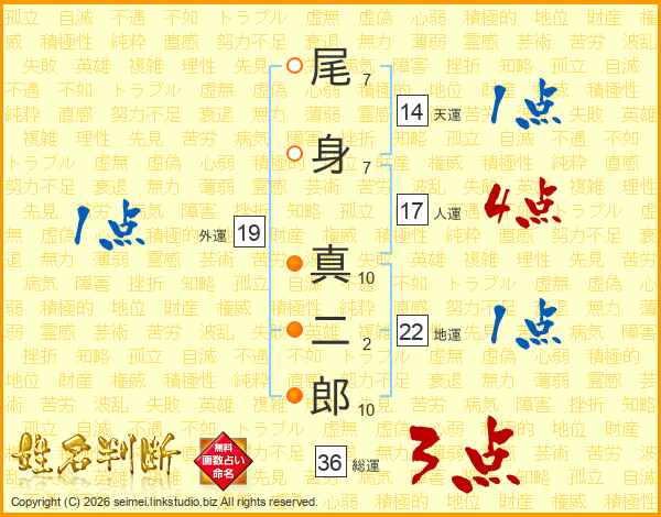 尾(7画)身(7画) 真(10画)二(2画)郎(10画)