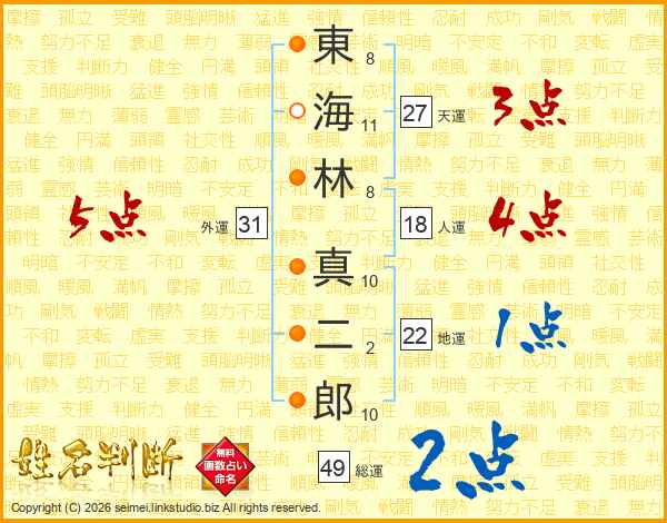 東(8画)海(11画)林(8画) 真(10画)二(2画)郎(10画)