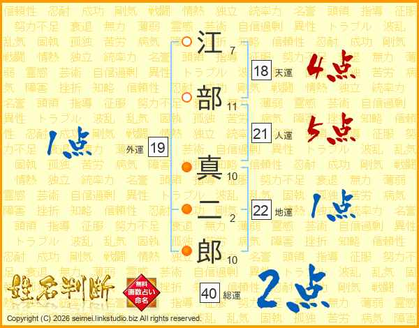 江(7画)部(11画) 真(10画)二(2画)郎(10画)
