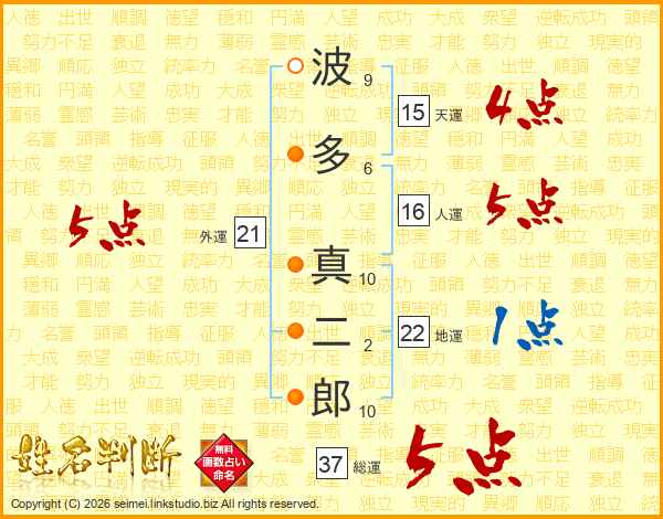 波(9画)多(6画) 真(10画)二(2画)郎(10画)