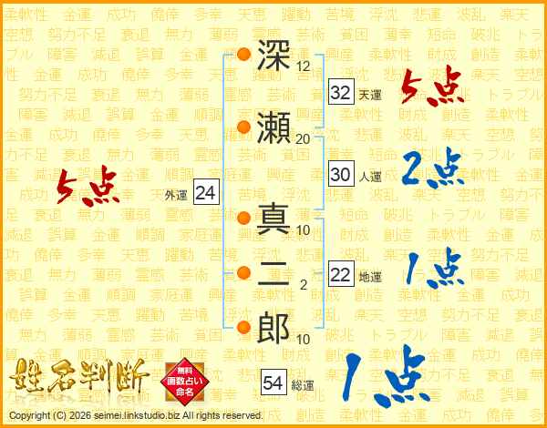 深(12画)瀬(20画) 真(10画)二(2画)郎(10画)