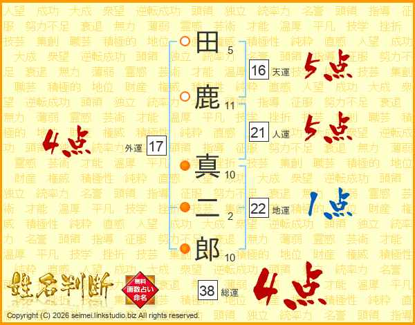 田(5画)鹿(11画) 真(10画)二(2画)郎(10画)