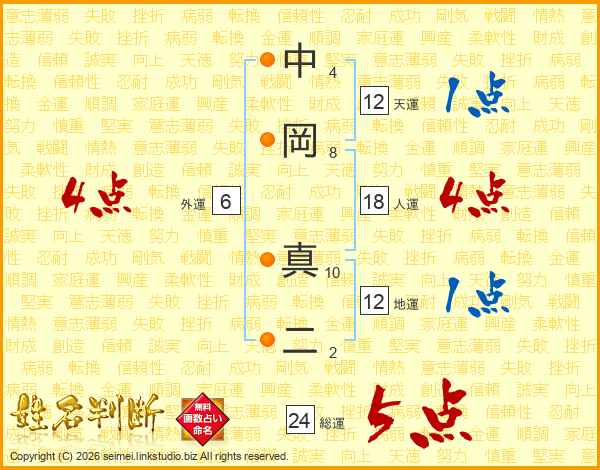あなたの人生を表す1番重要な運勢です。生涯を通じて影響する総合運となり、主に50歳以降の晩年期に影響を及ぼします。苗字と名前の合計画数。